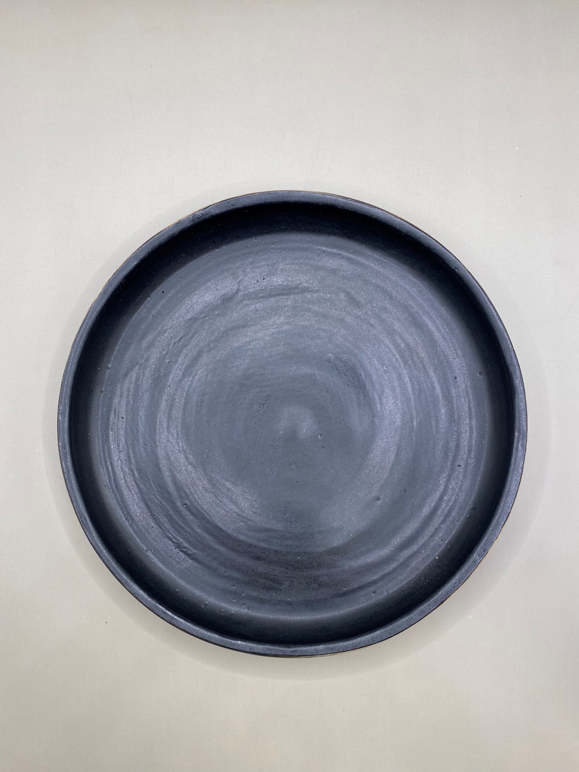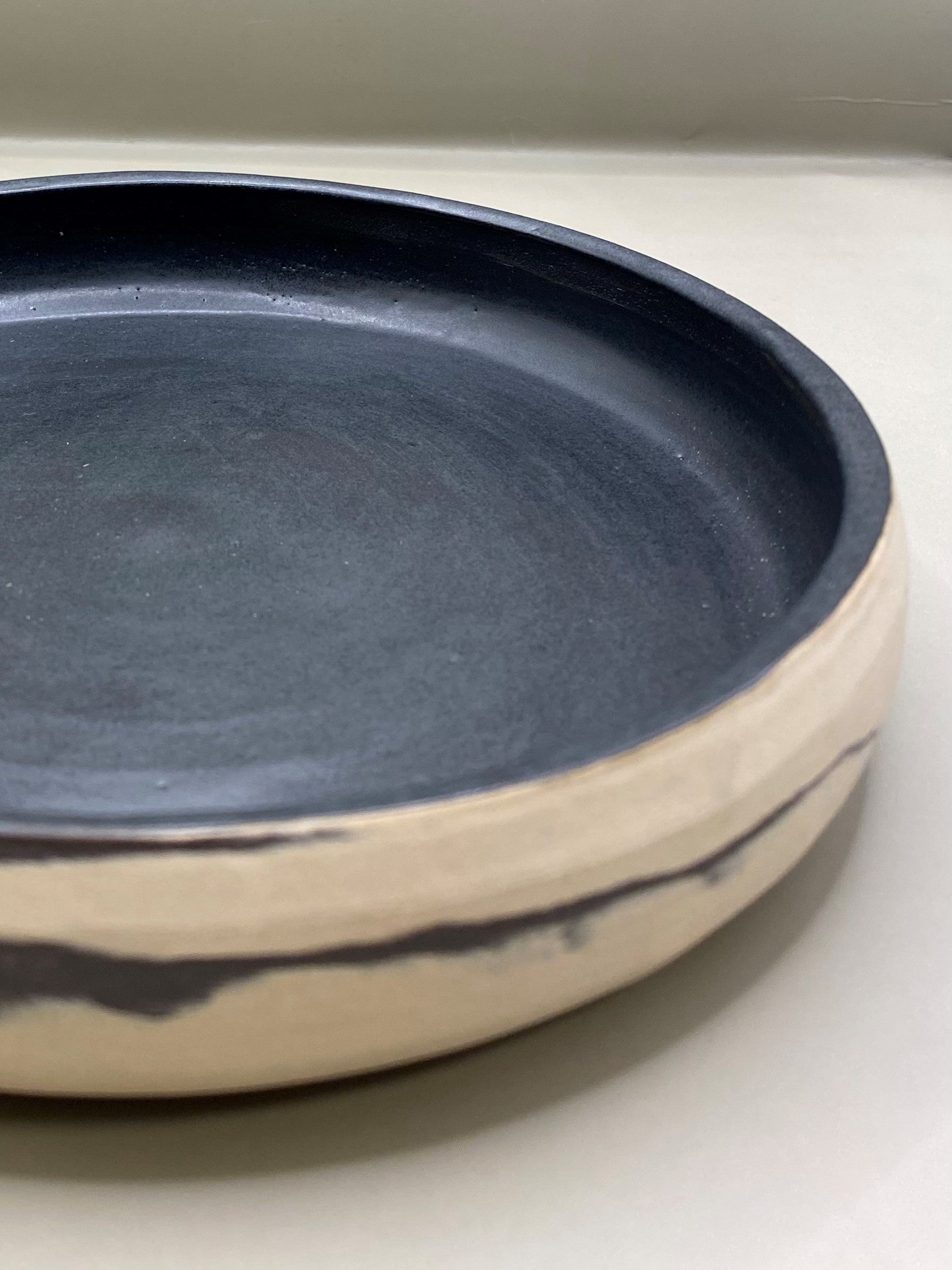 צלחת עמוקה בעבודת יד בעיצוב מנימליסטי, בצבעי חימר לבן ושחור בשילוב גלזורה שחור מט בתוך הכלי שמאפשרת ניקוי קל של הכלי