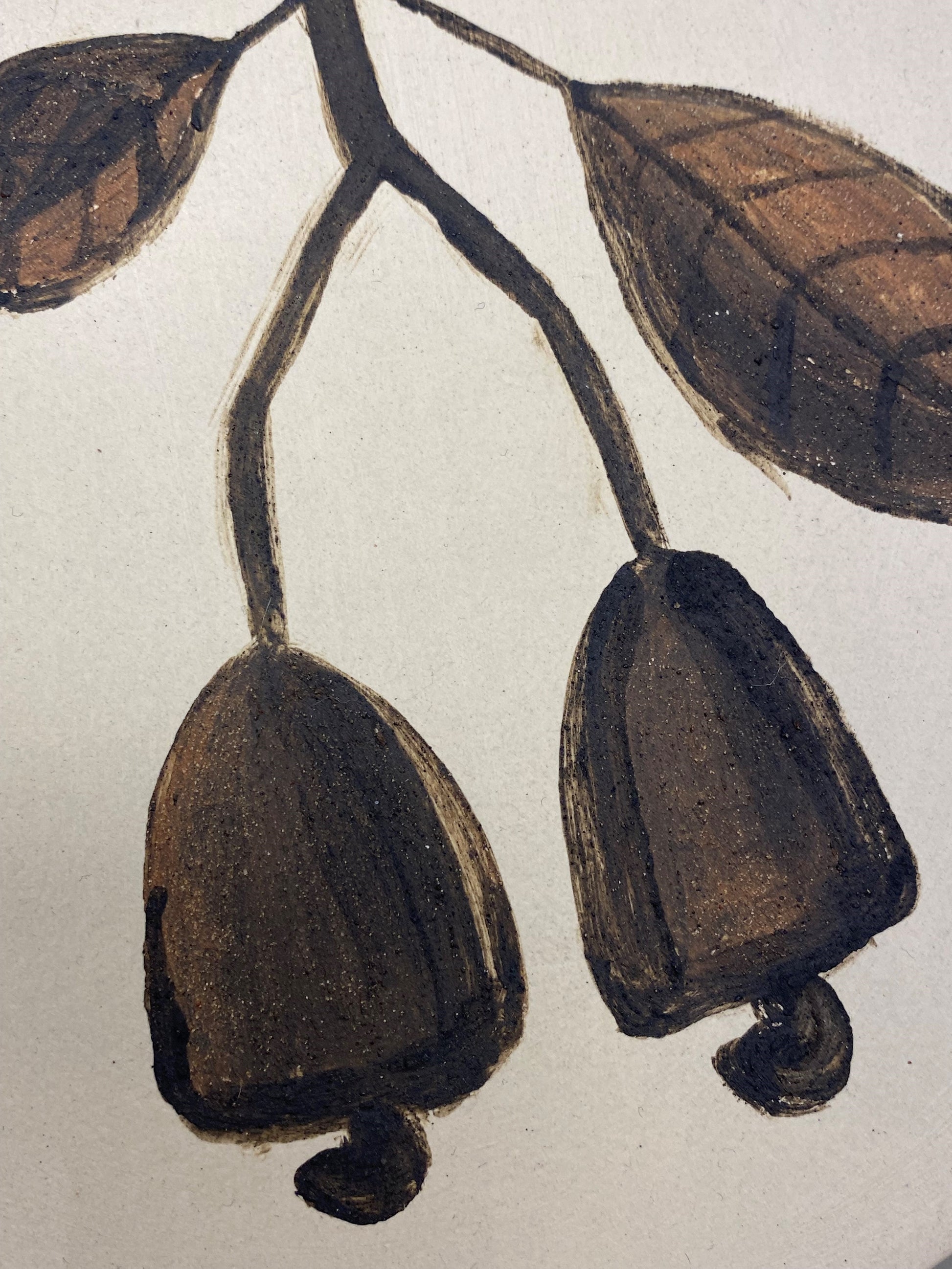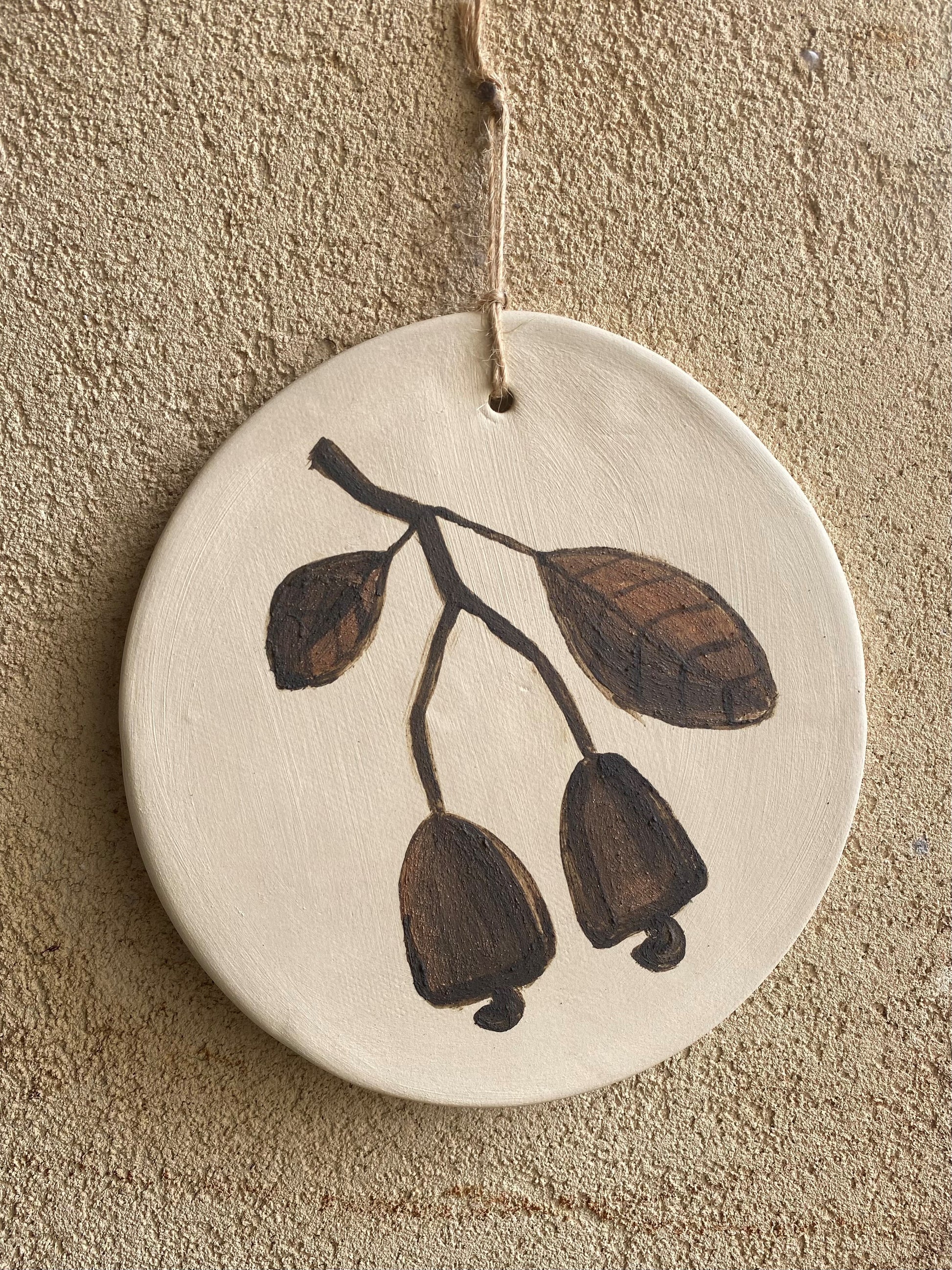 על גבי החימר מצוייר ענף עם עלים ופירות - עיצוב שמכניס חמימות וטבע לכל חלל
