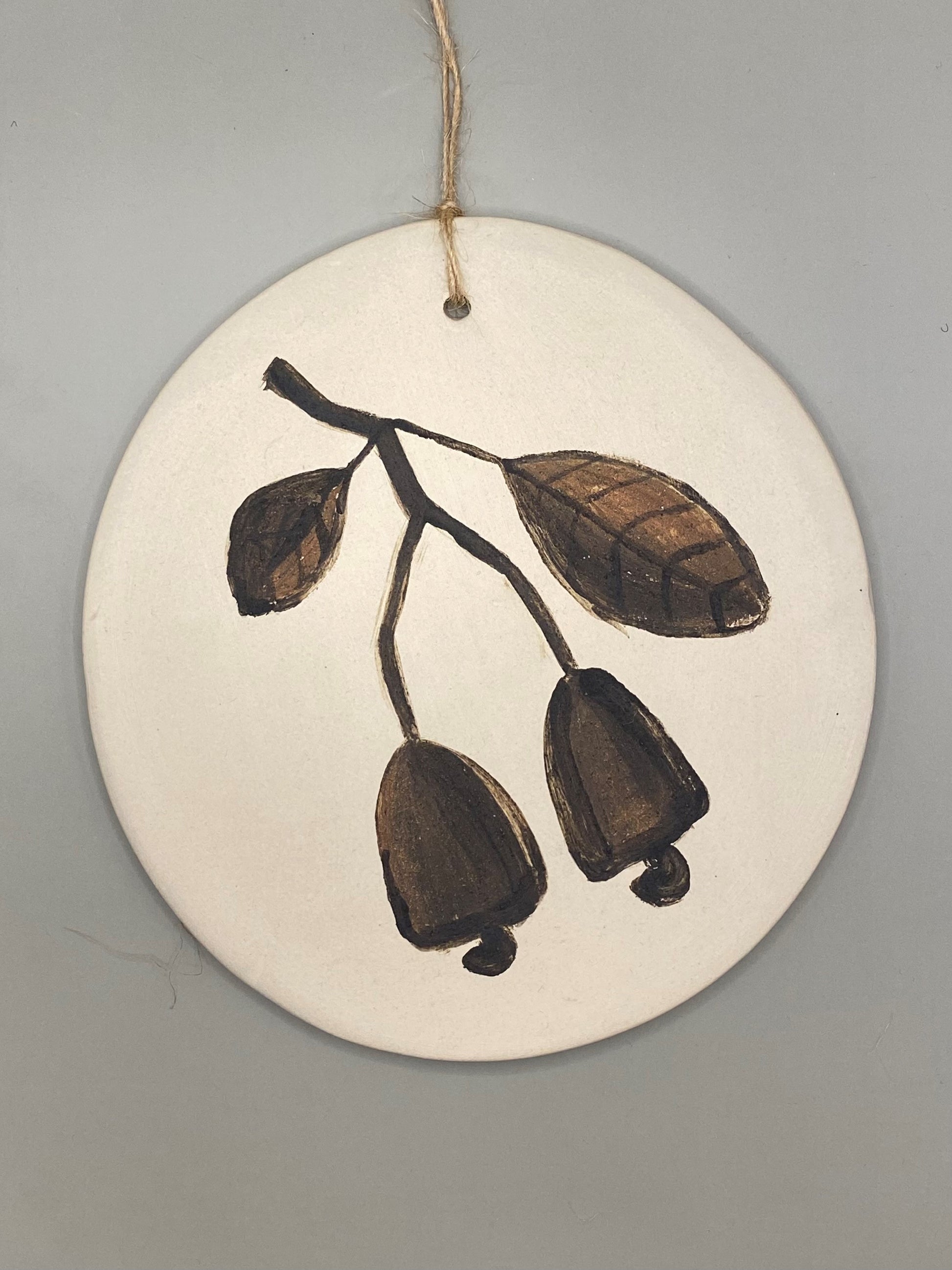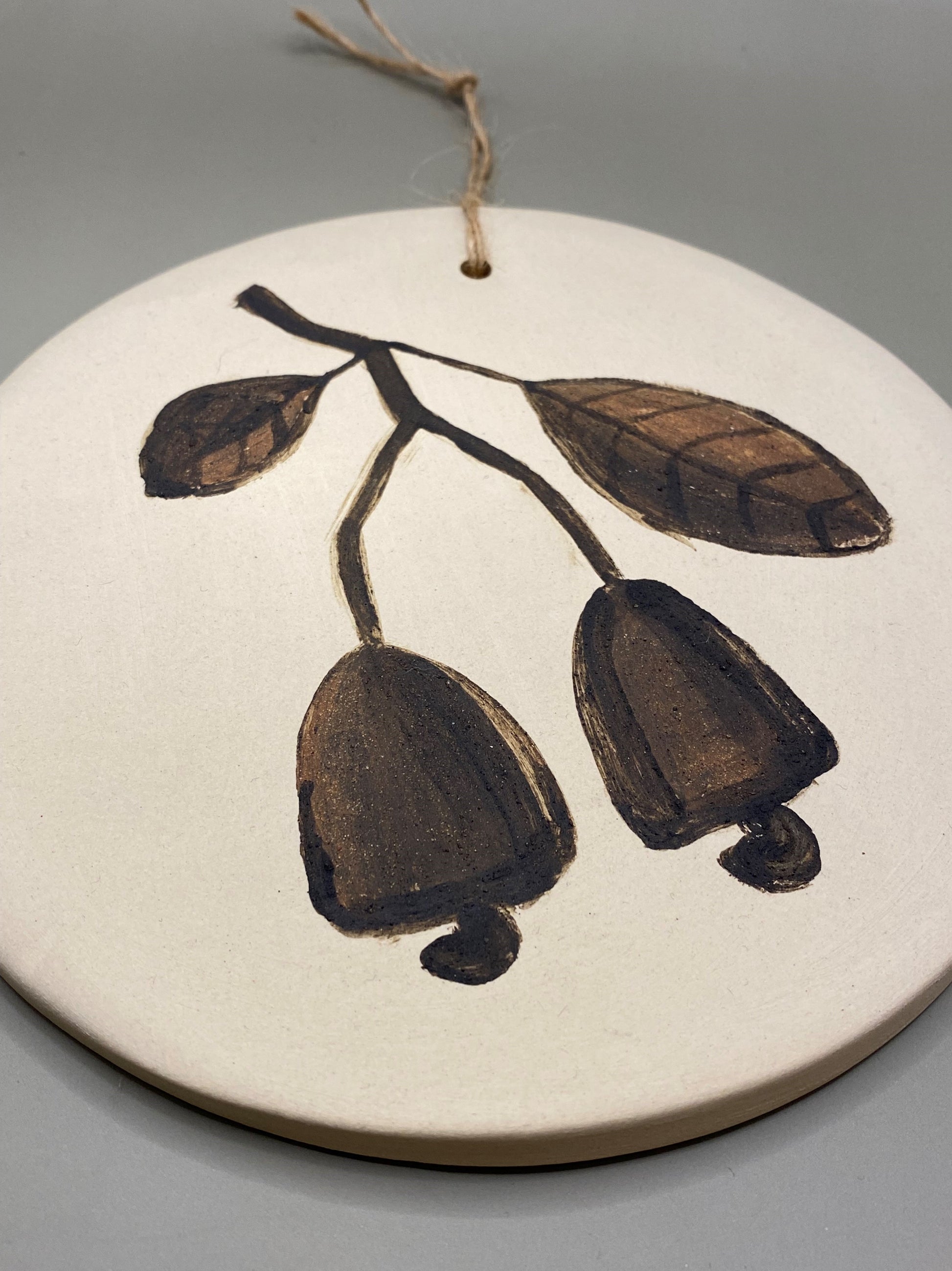 תמונה עגולה מקרמיקה עבודת יד, עשויה מחימר לבן ומצויירת ביד בגוונים טבעיים של חימר חום