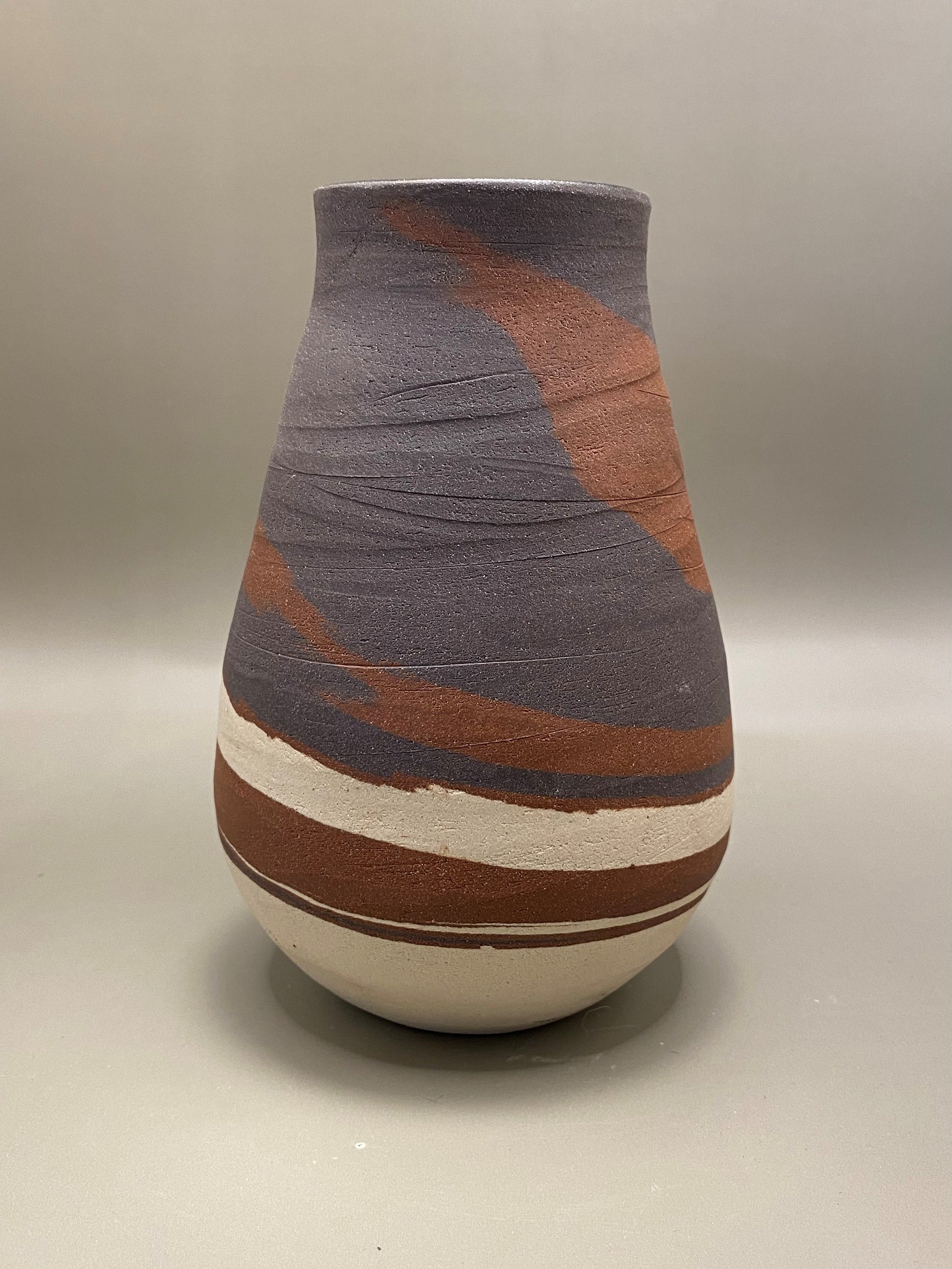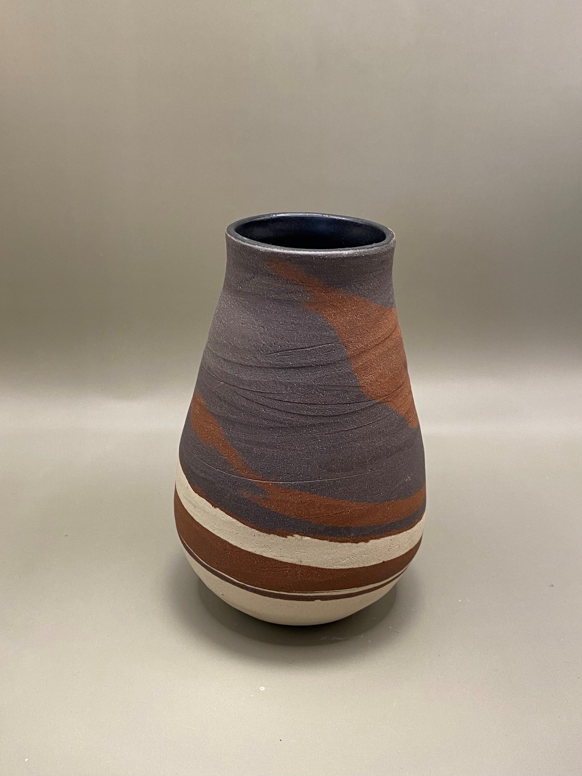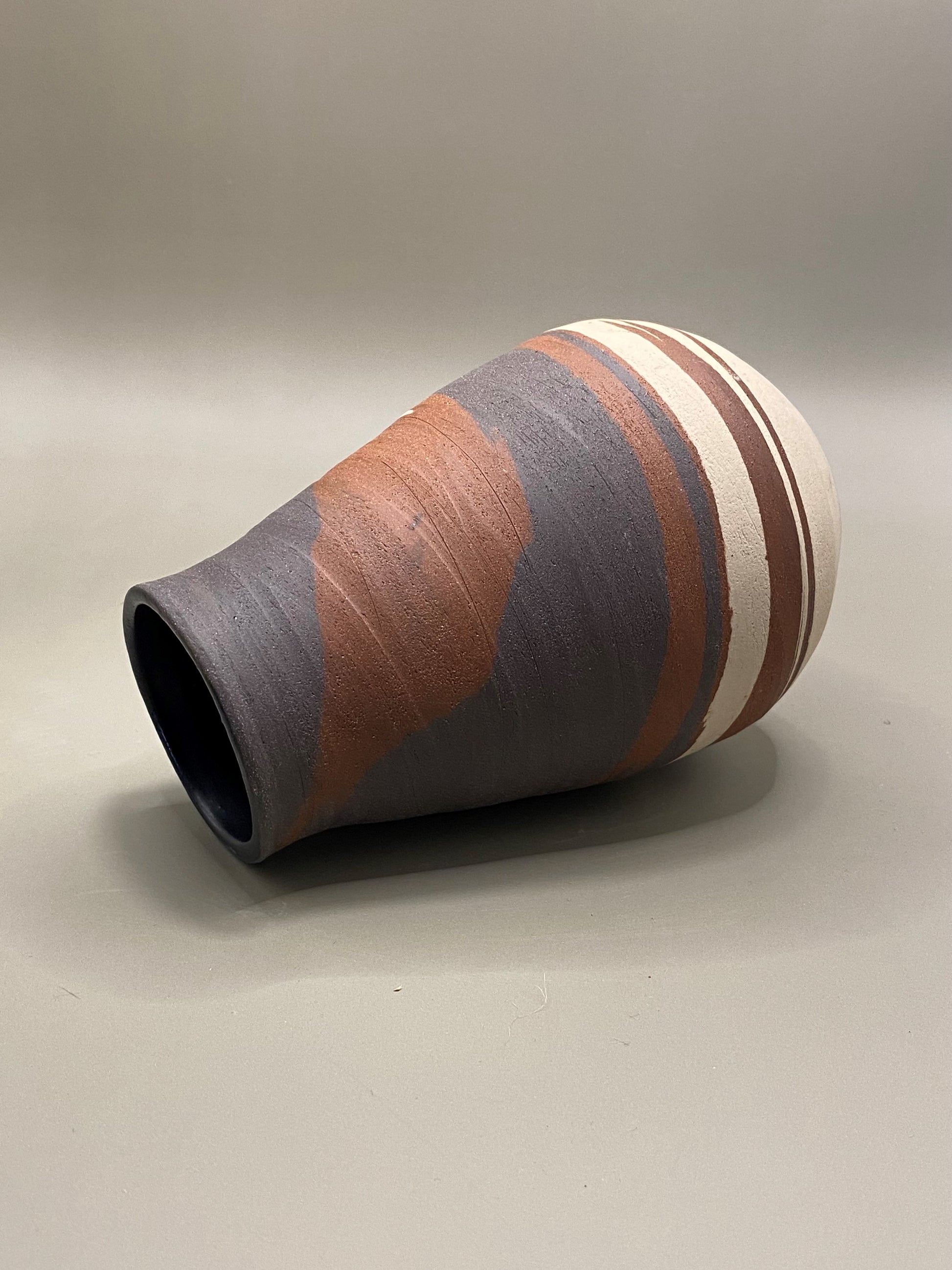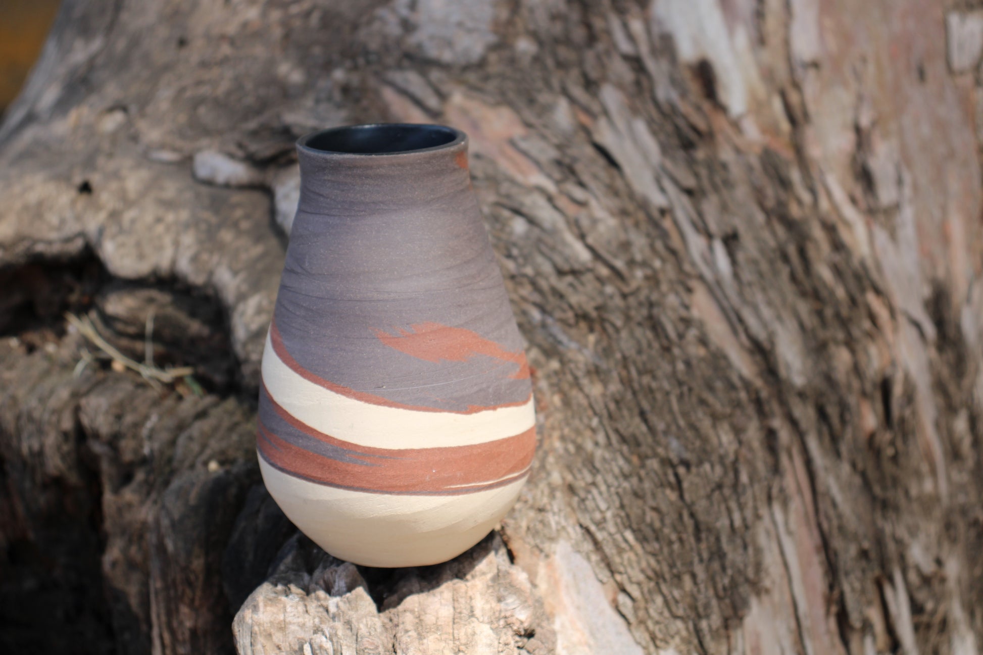 כד יחודי מעבודת יד, עשוי מחימר מעורב בגווני חימר טבעיים - לבן, חום כהה וטרקוטה, שיוצרים יחד עם החרצים בחימר מראה גולמי ואורגני