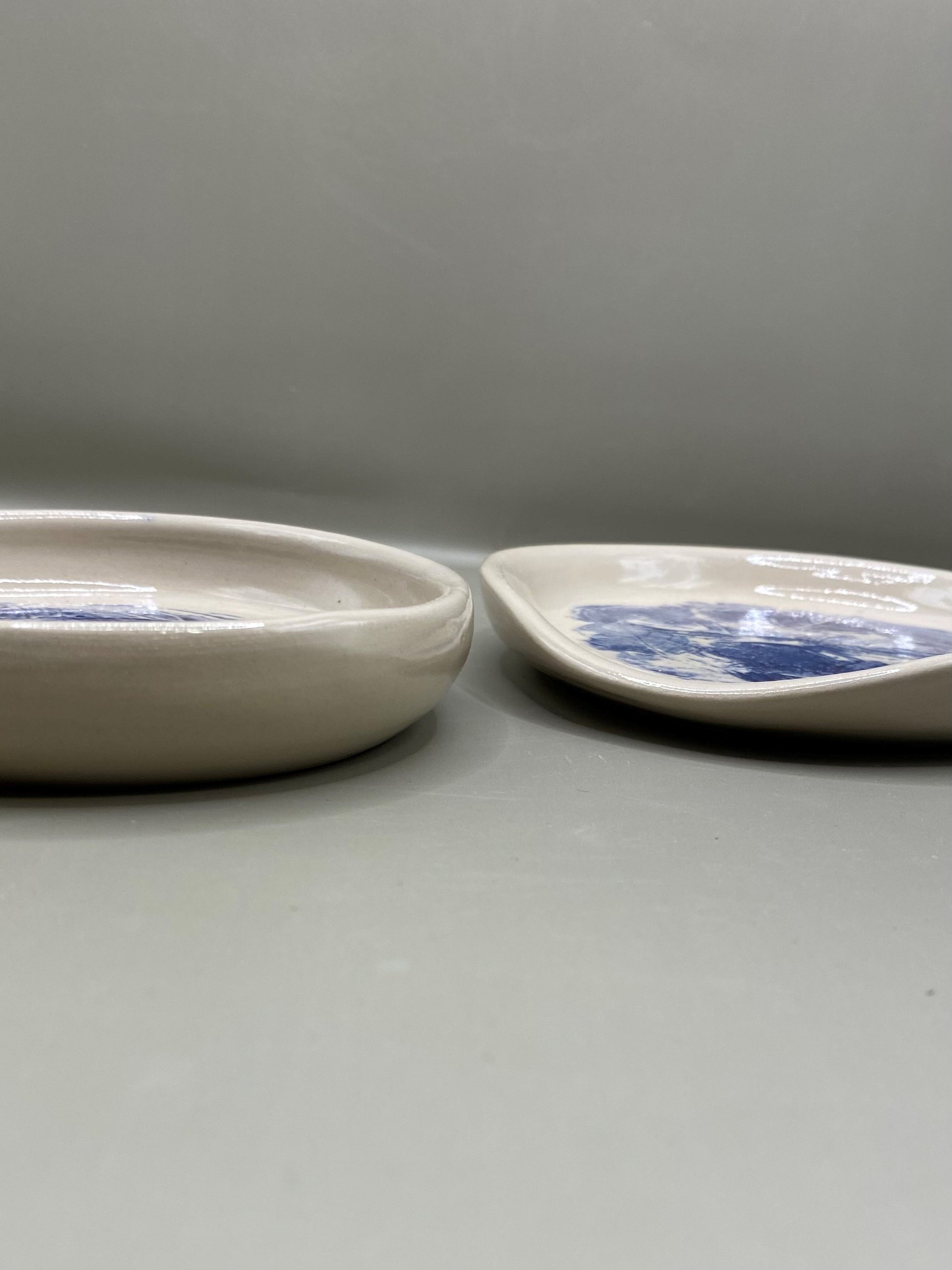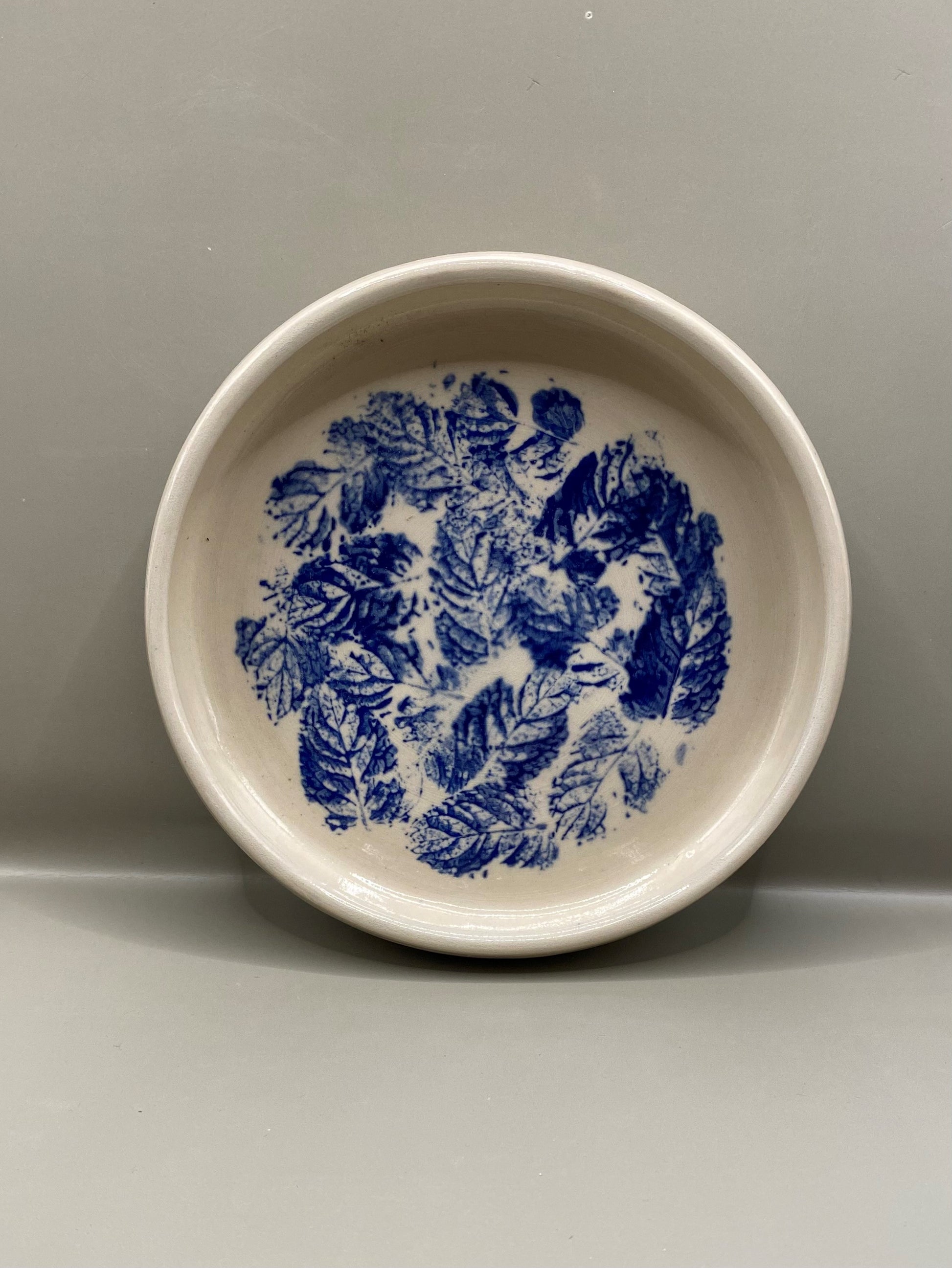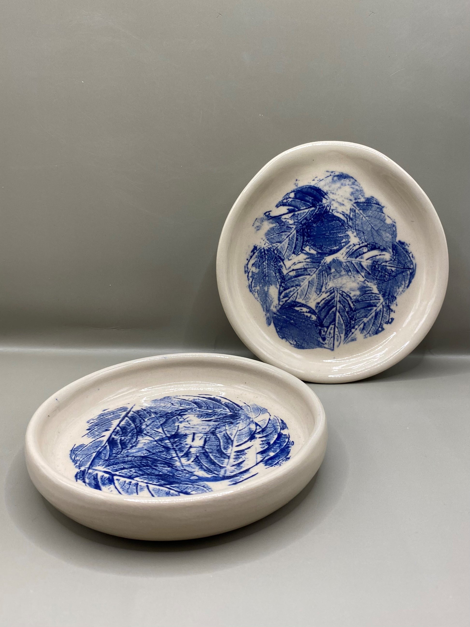 הצלוחיות מיוצרות על האובניים מחימר לבן בעבודת יד מוקפדת ועליהן מוטבעים בעדינות עלים בגוון כחול עמוק שיוצרים מראה טבעי, רגוע ואלגנטי