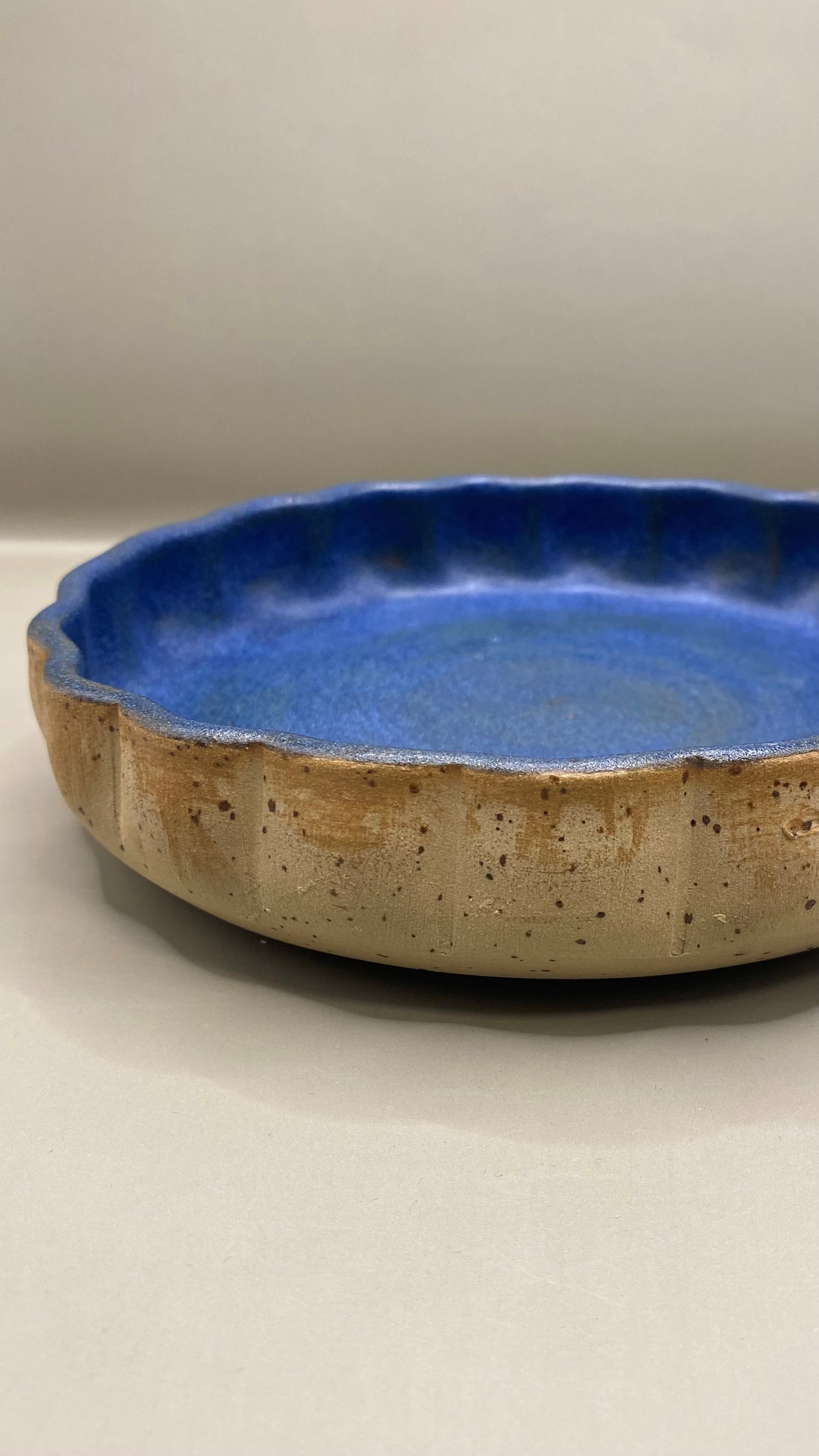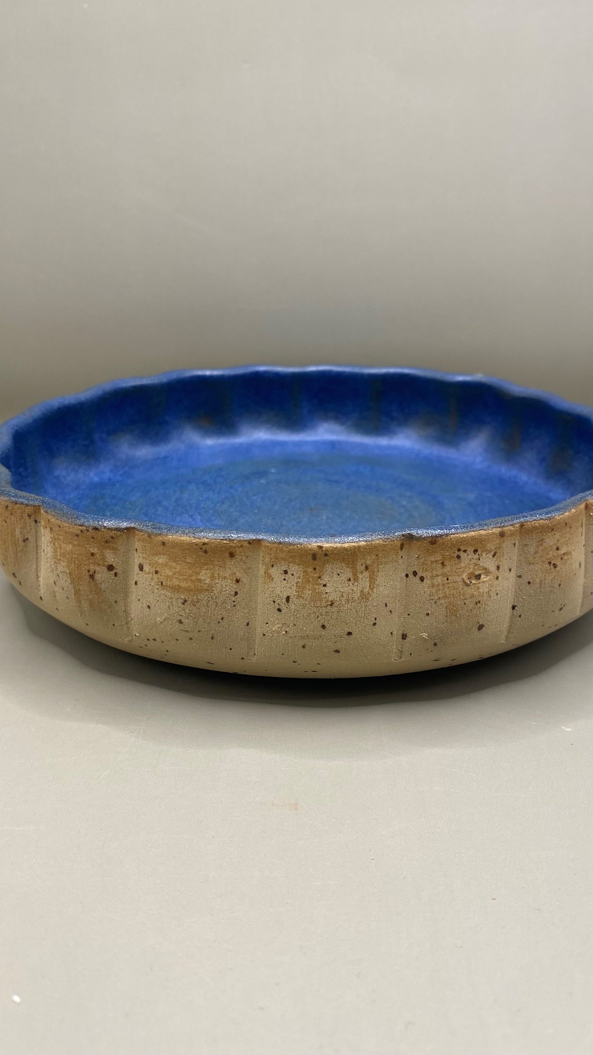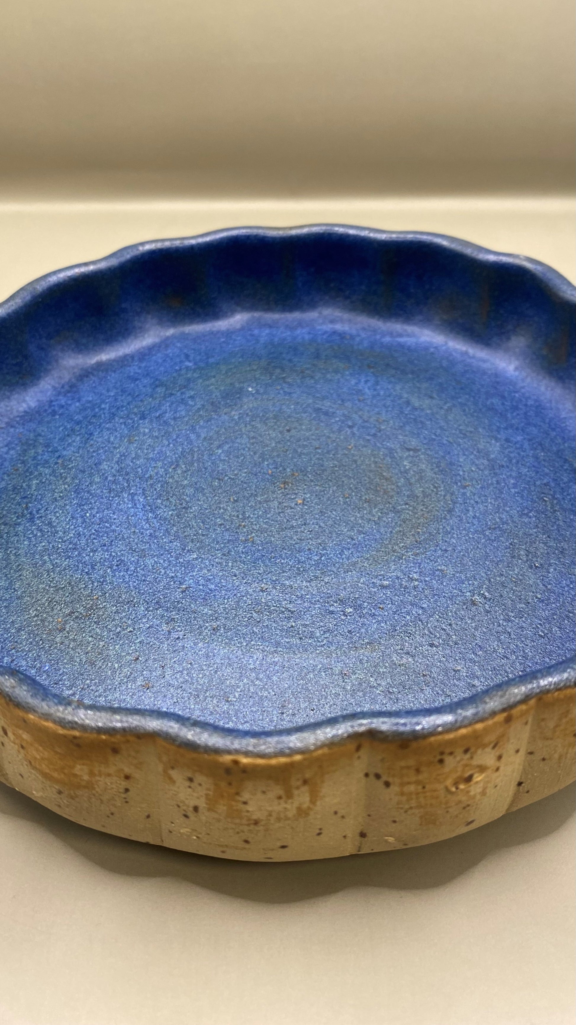 צלחת גבוהה יחודית עבודת יד, עשויה מחימר אוקר מנוקד בצורת דלעת. פנים הכלי מזוגג בגלזורה כחולה שמוסיפה עומק ואלגנטיות לכלי