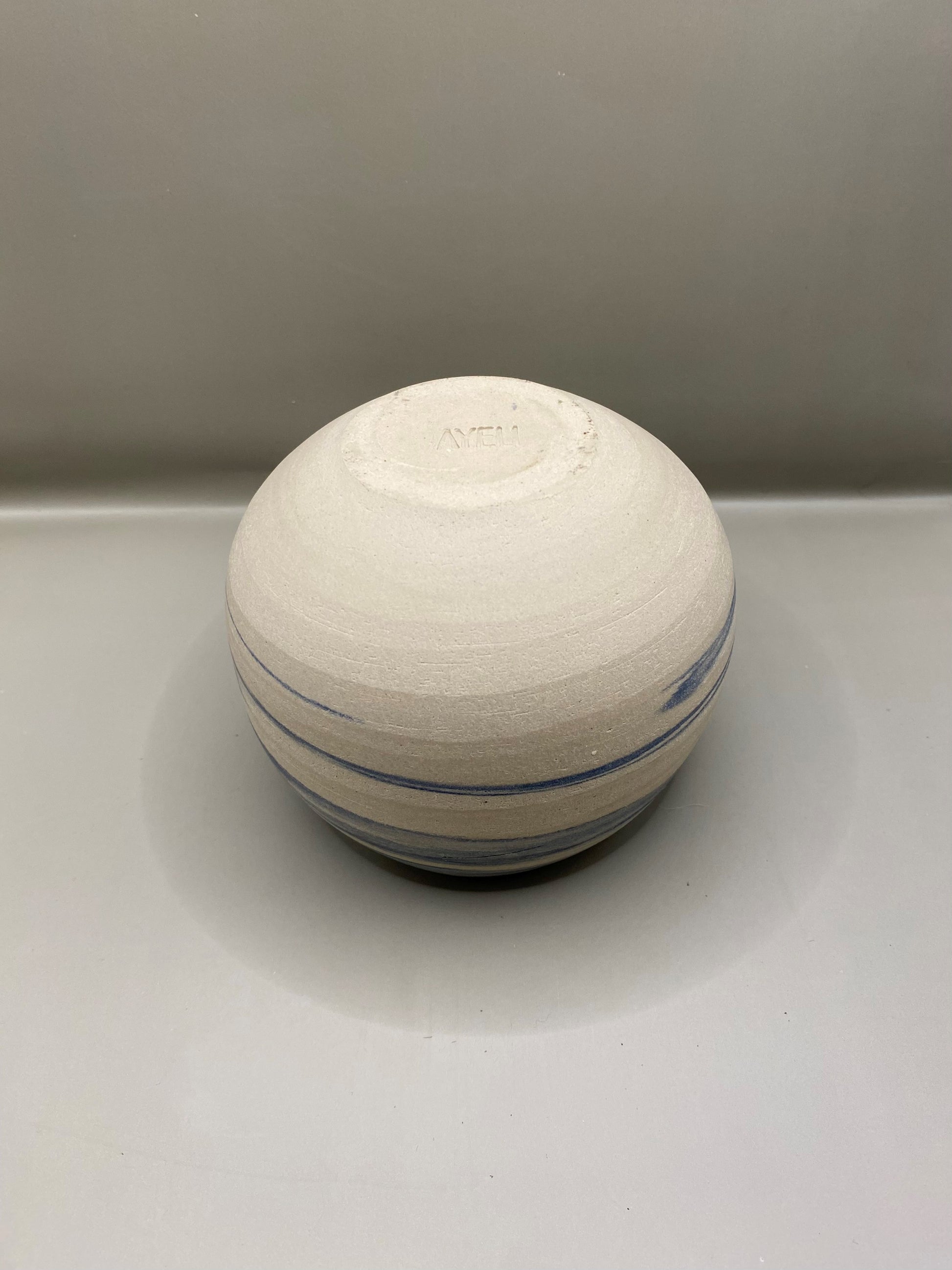 כלי כדורי יחודי עבודת יד, עשויה מחימר לבן שעורבב עם חימר צבוע בצובען כחול, ליצירת דוגמא חד פעמית במרקם יחודי שאין שני לו