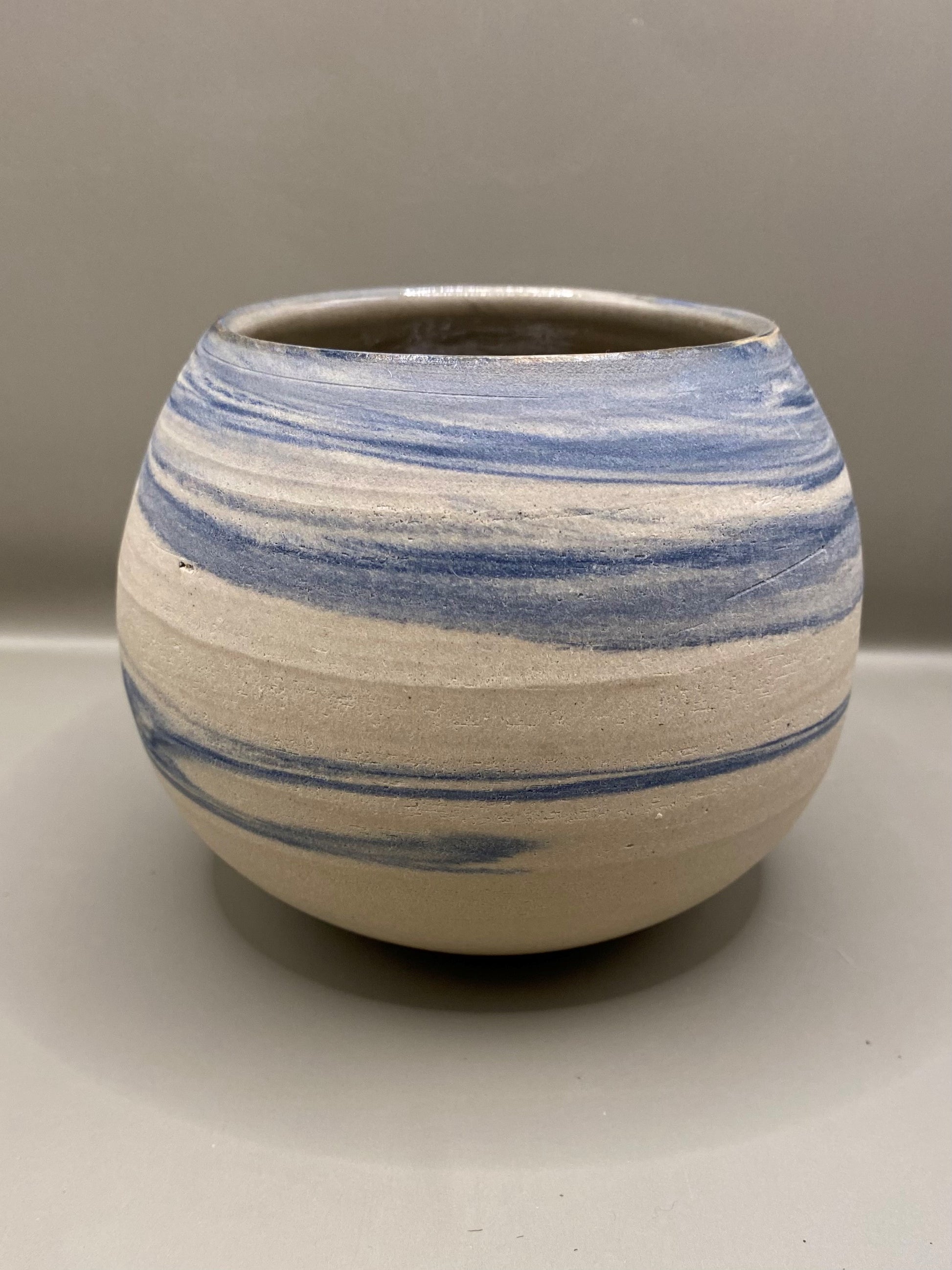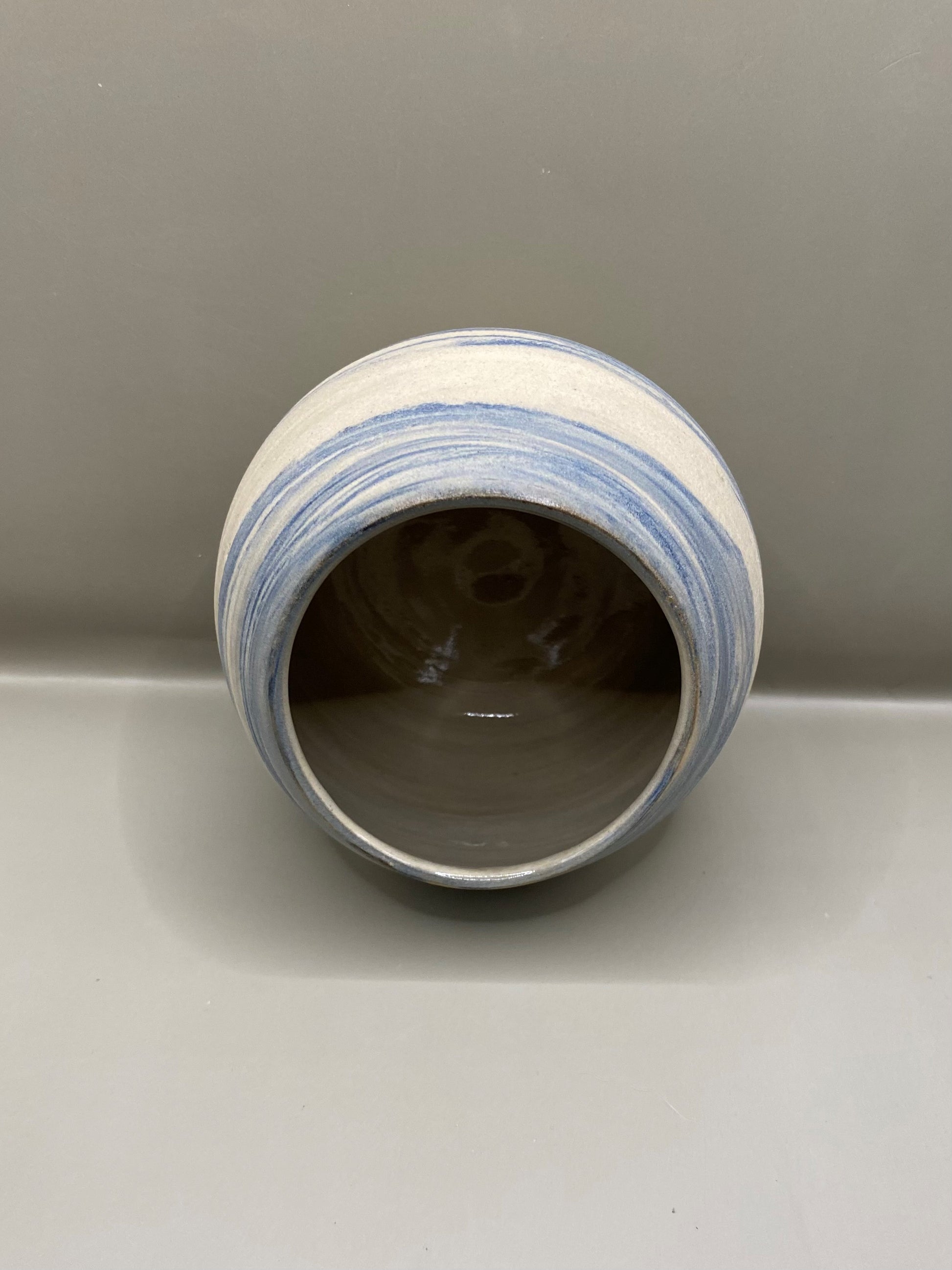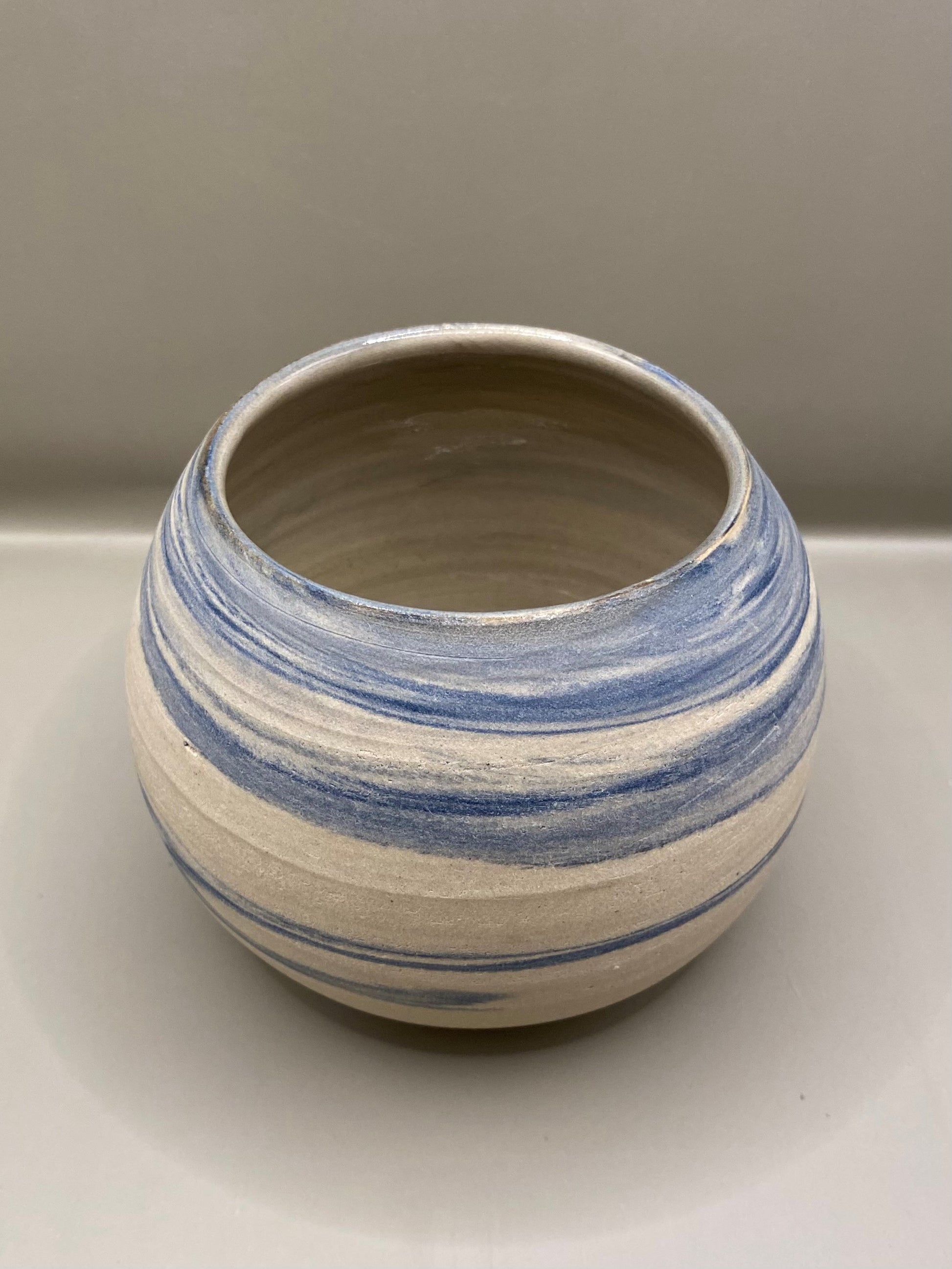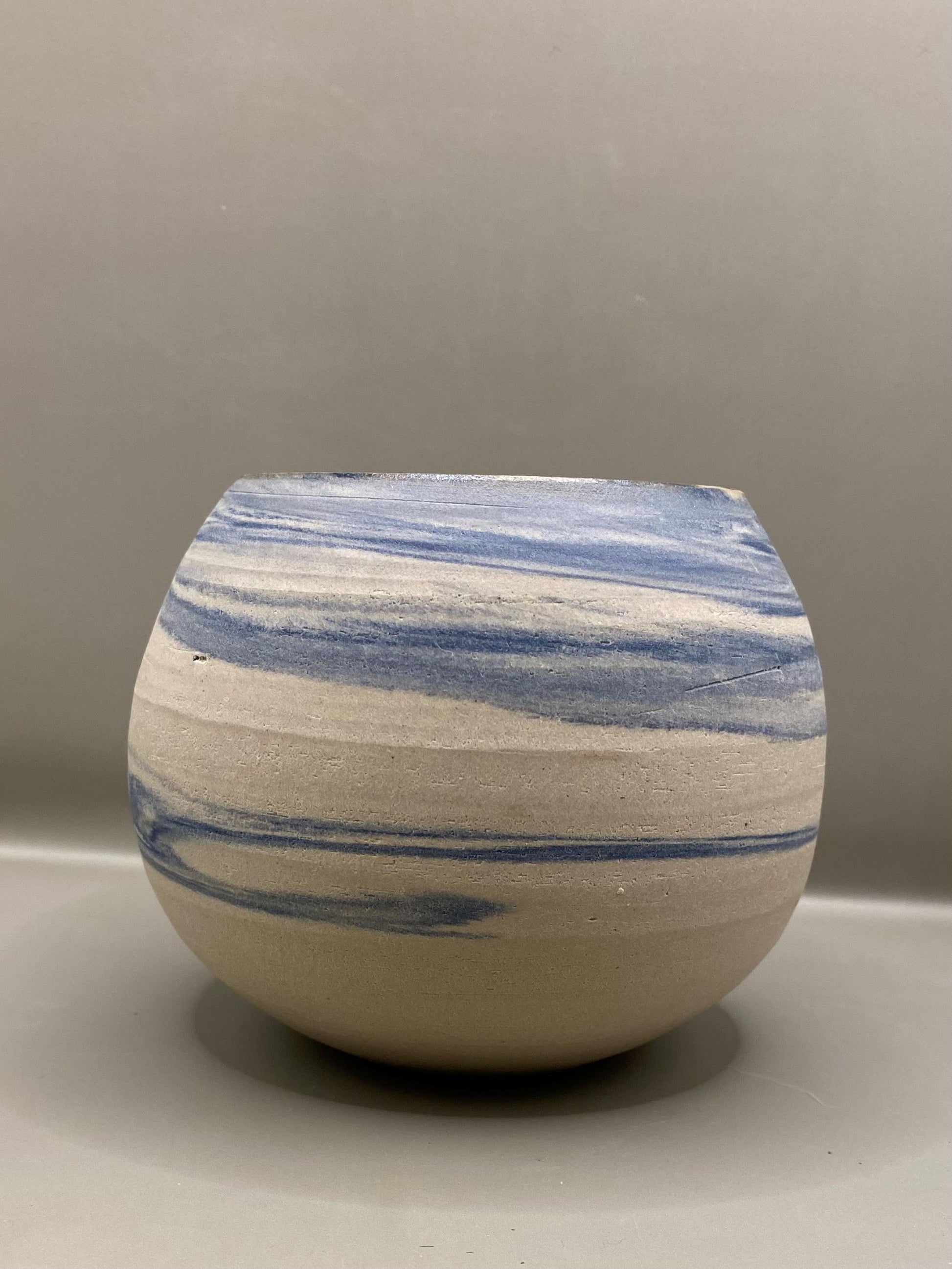 כד עגול מחימר מעורב לבן וכחול