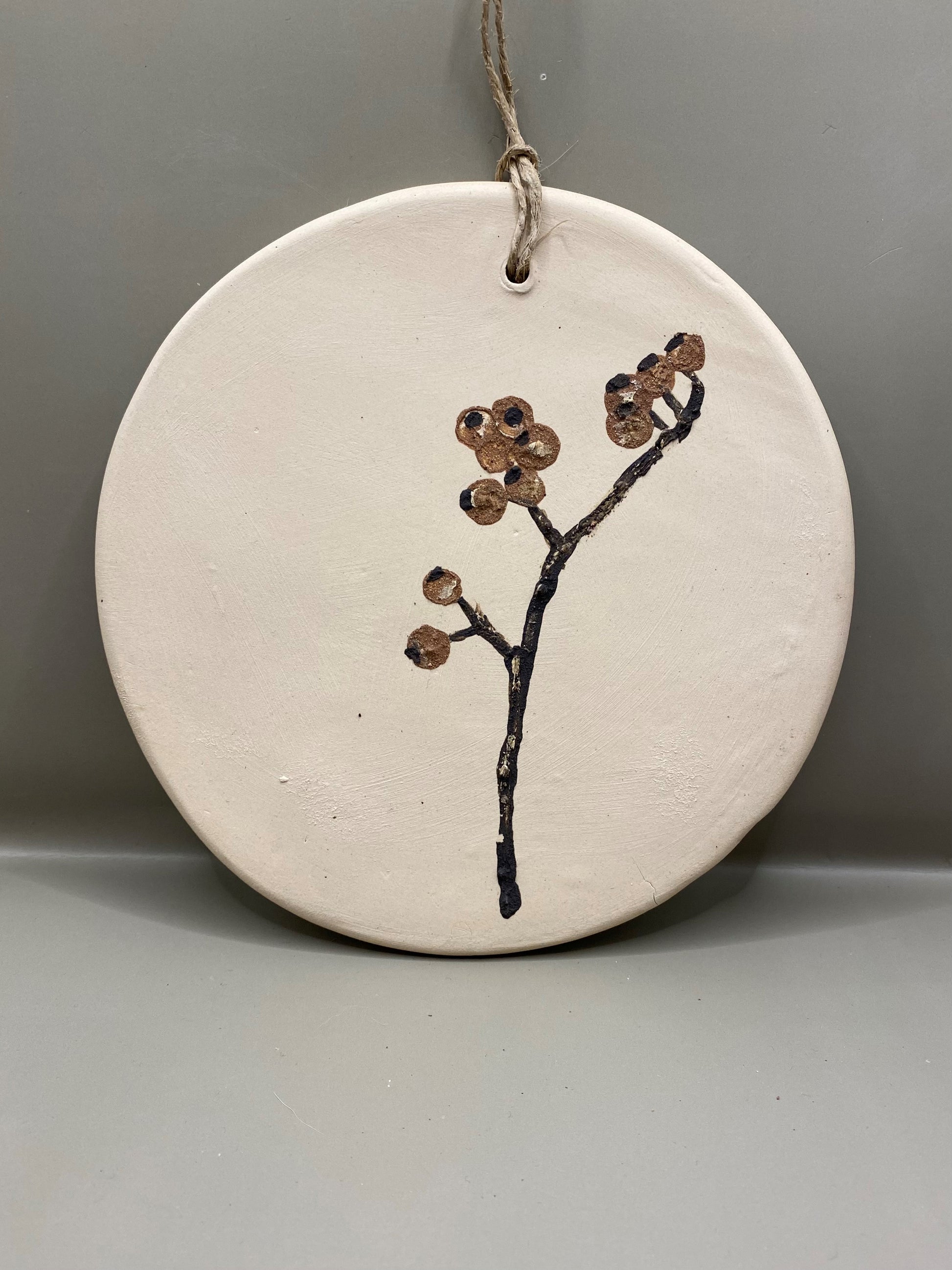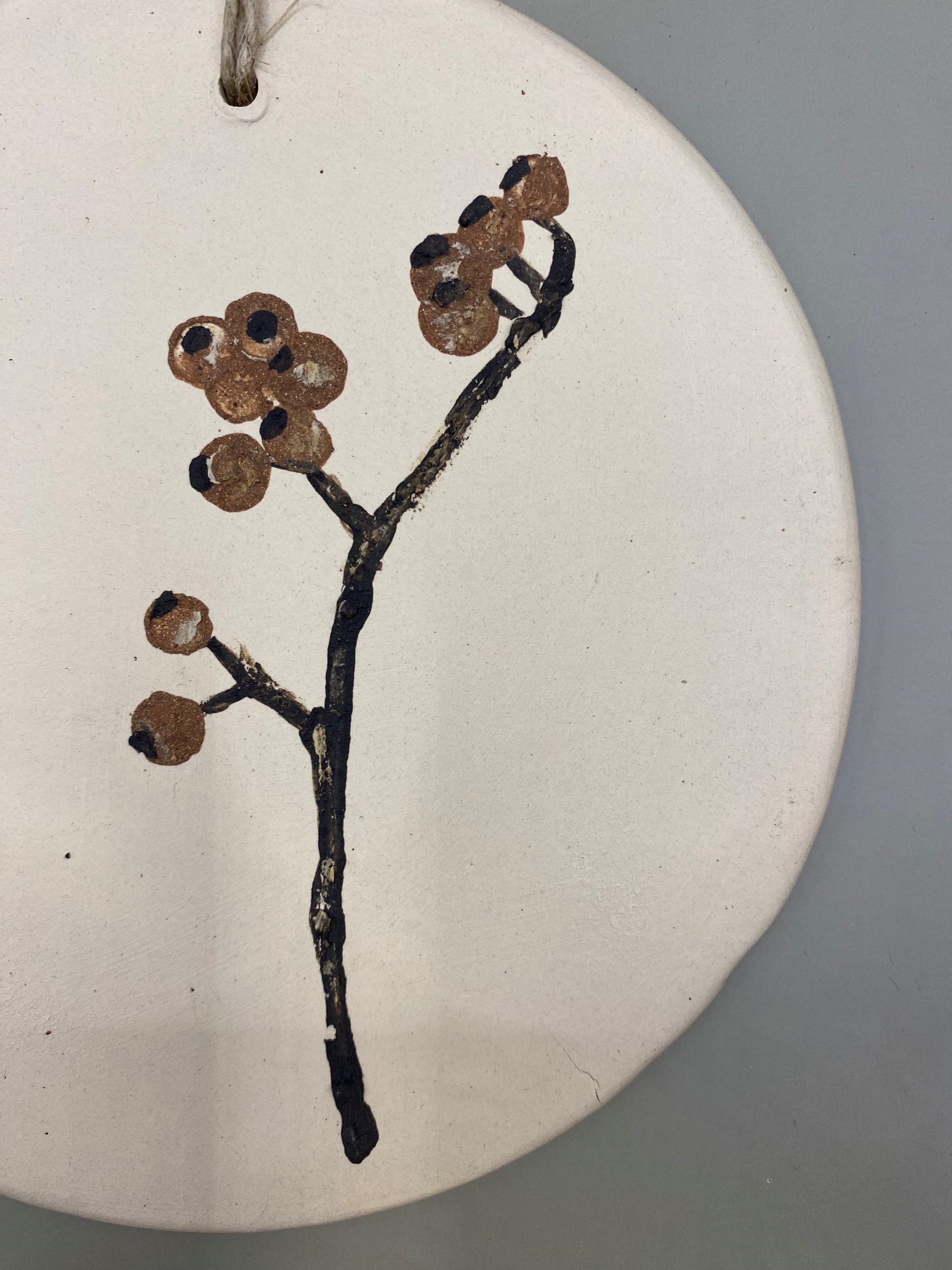 תמונה עגולה מקרמיקה עבודת יד, עשויה מחימר לבן ומצויירת ביד בגוונים טבעיים של חימר חום